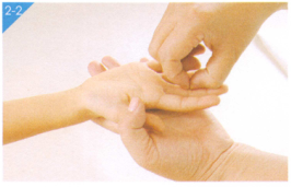 2、掐揉推四横纹4分钟(图2-1、图2—2、图2-3、图2—4);揉板门50次(图2-5)。